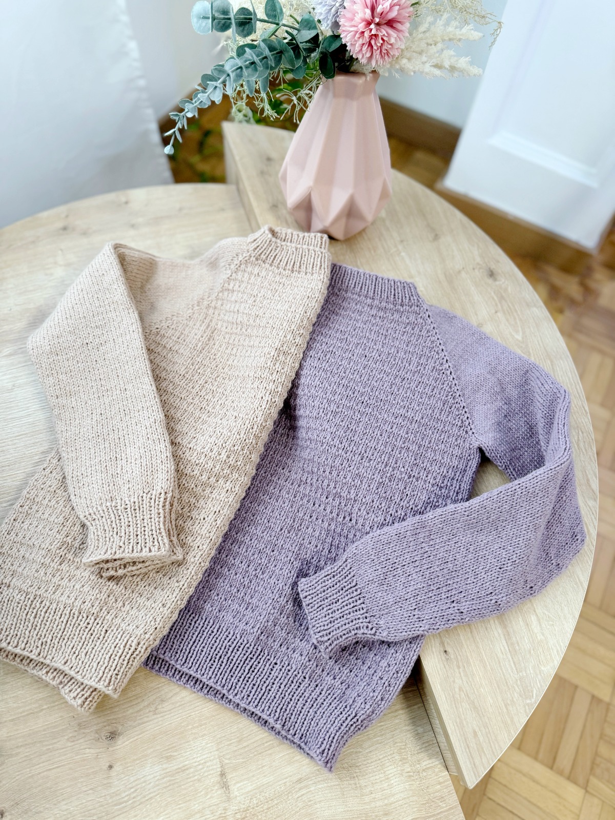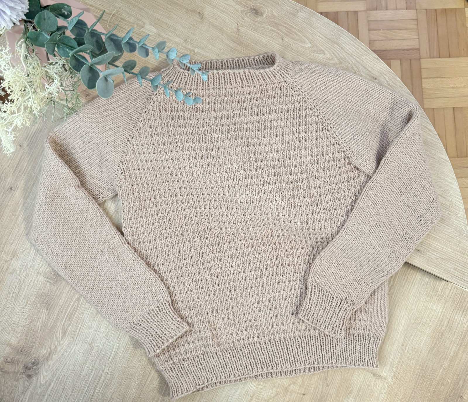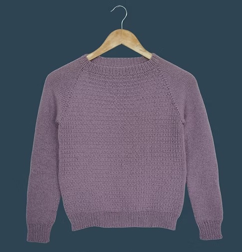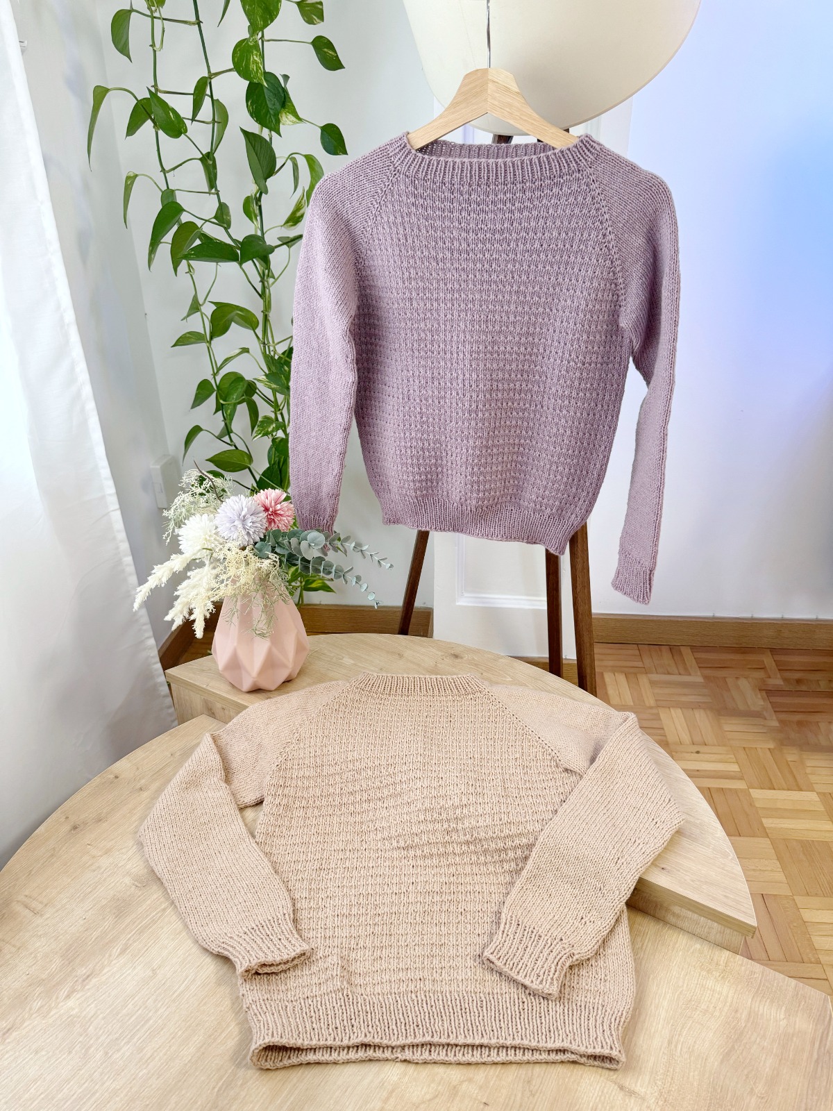 Este jersey se empieza tejiendo el escote, a continuación se teje el canesú y el cuerpo y, por último, se tejen las mangas. Se realiza de una sola pieza, sin ninguna costura, en punto del derecho alternando con filas en punto derecho y revés.
